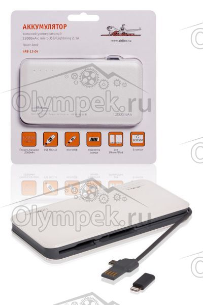 • Airline APB1204 Аккумулятор внешний универсальный 12000мАч: microUSB/Lightning 2.1A (APB-12-04)